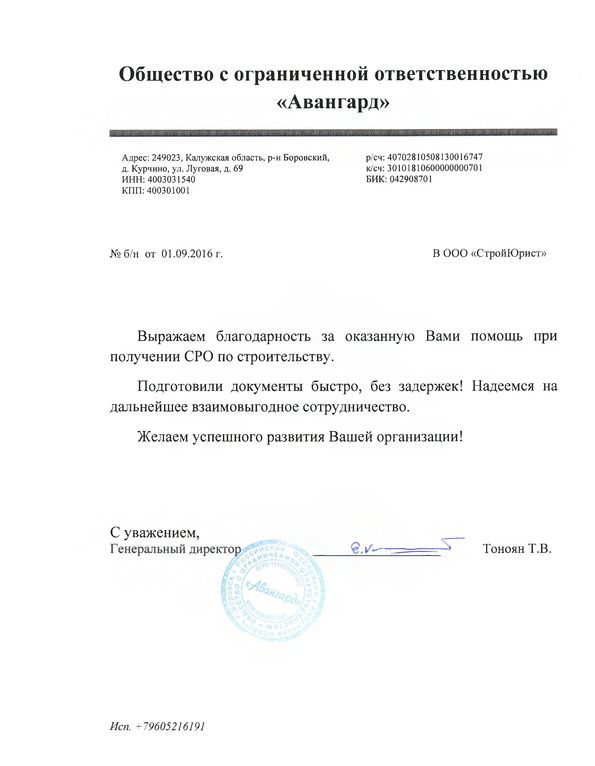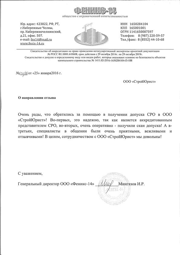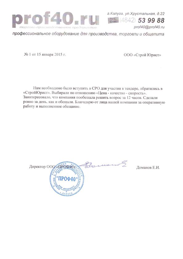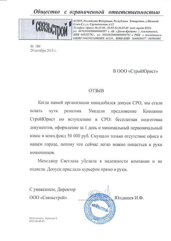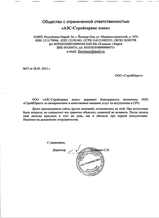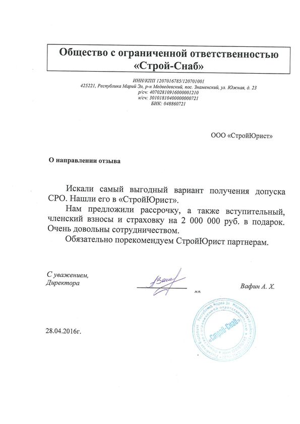 Отзывы клиентов "СтройЮрист" по вступлению в СРО в Череповце