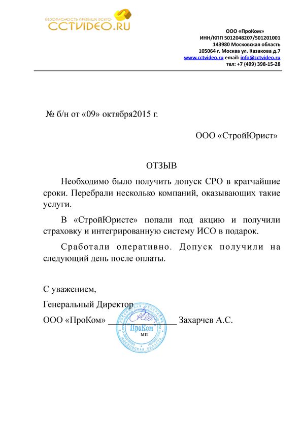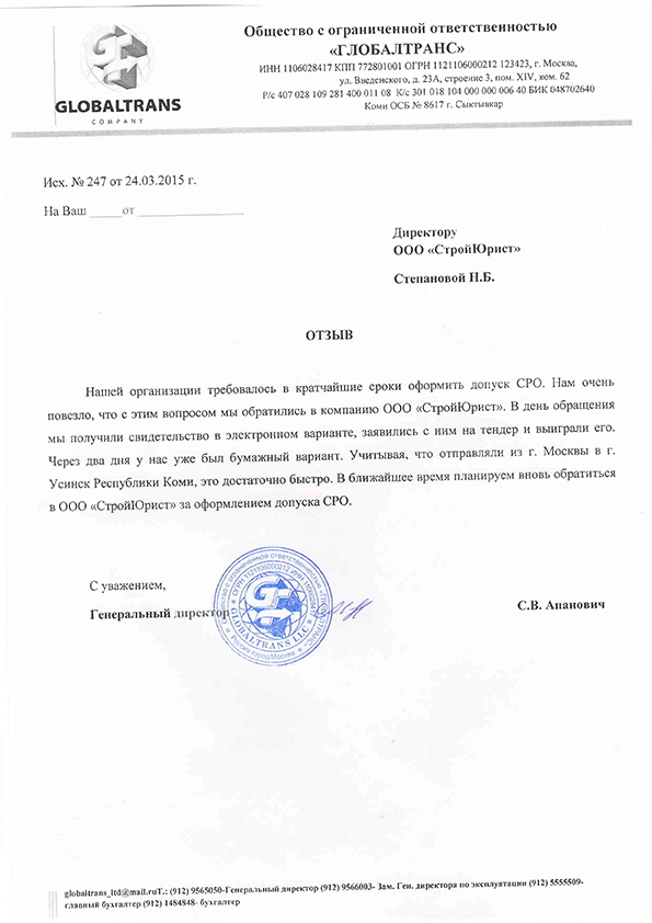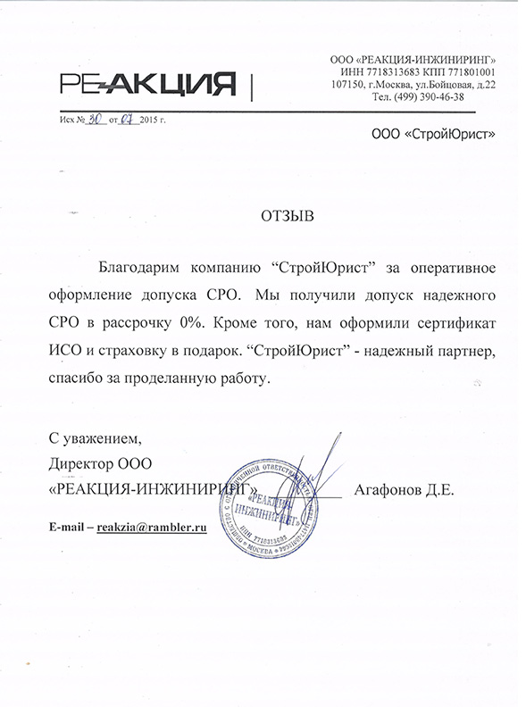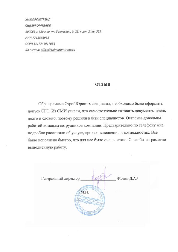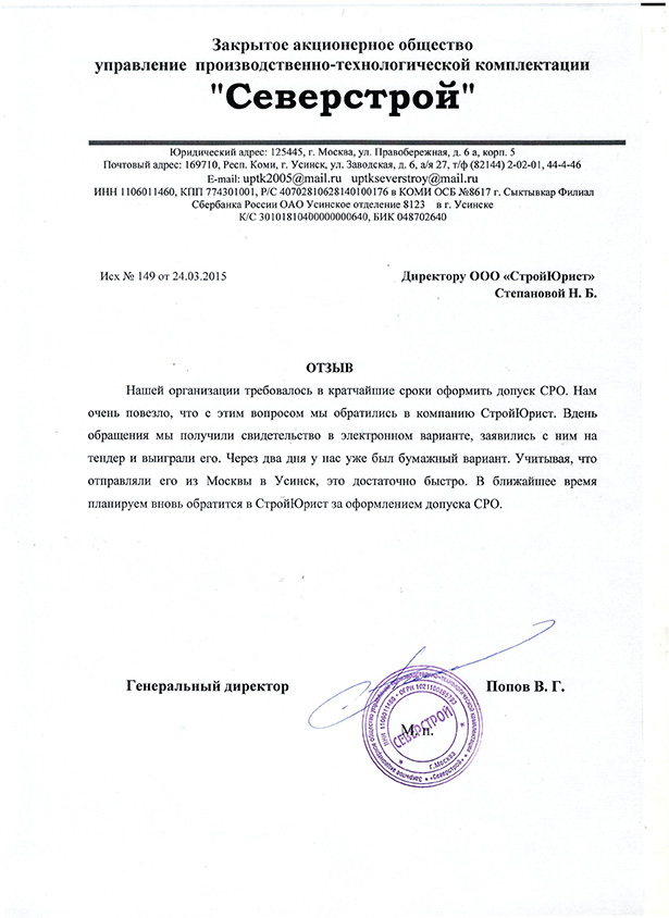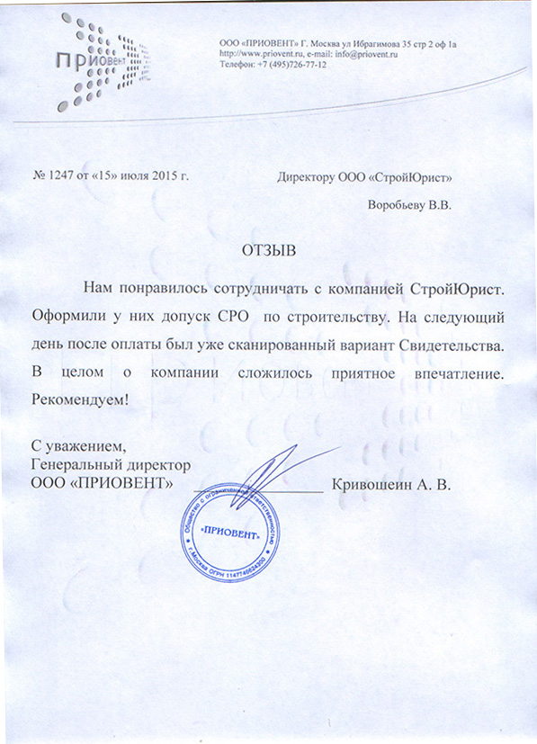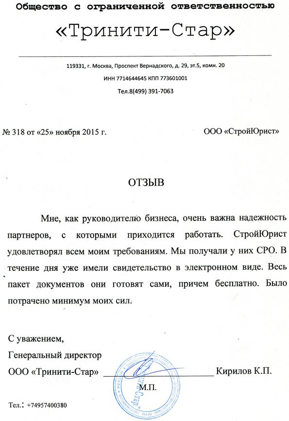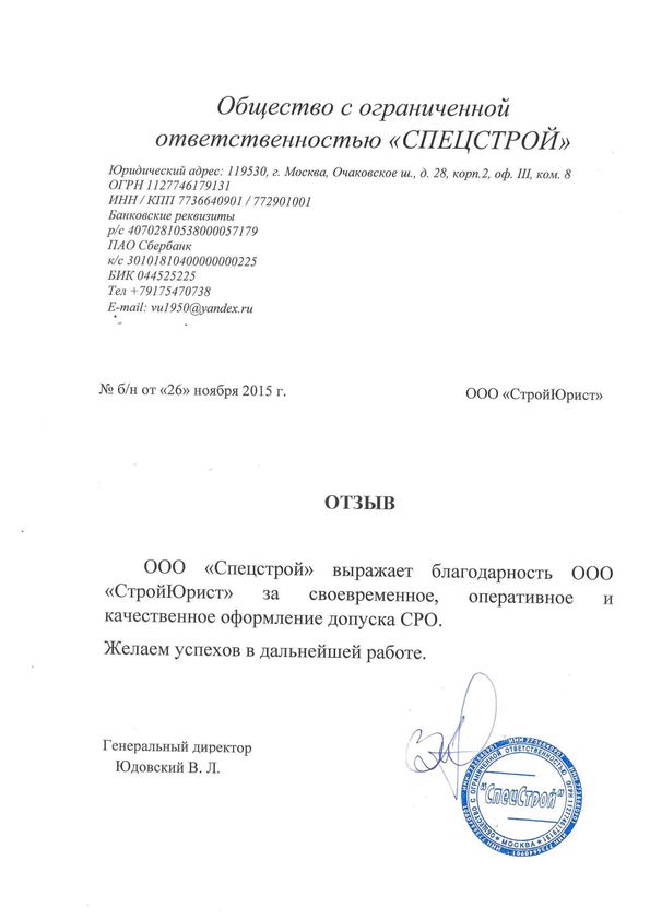 Отзывы клиентов "СтройЮрист" по вступлению в СРО в Череповце