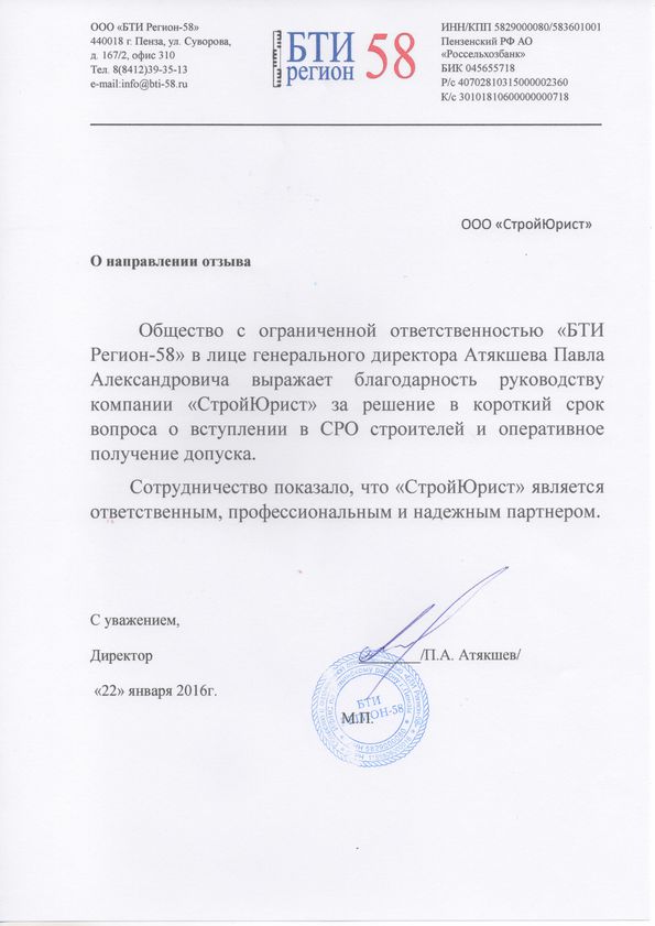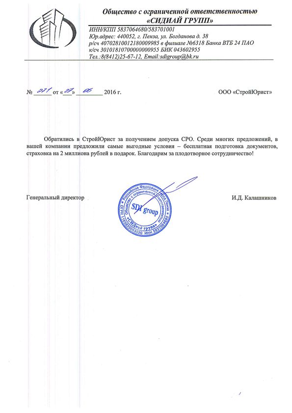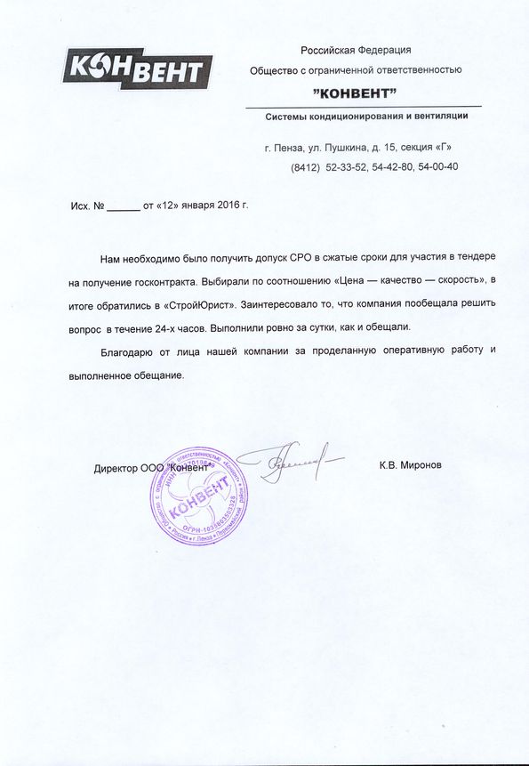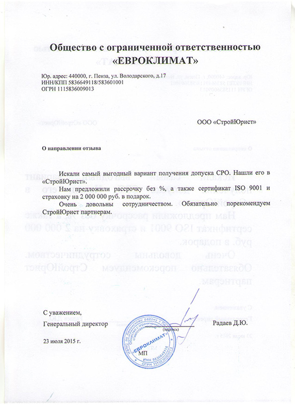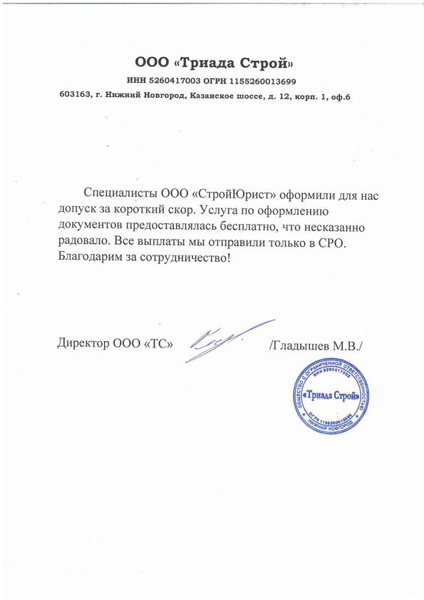 Отзывы клиентов "СтройЮрист" по вступлению в СРО в Череповце