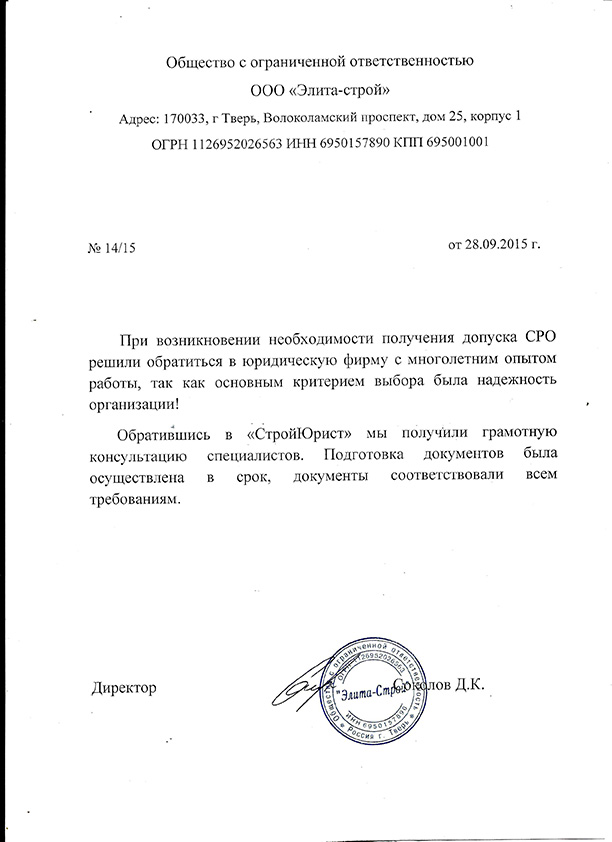 Отзывы клиентов "СтройЮрист" по вступлению в СРО в Череповце