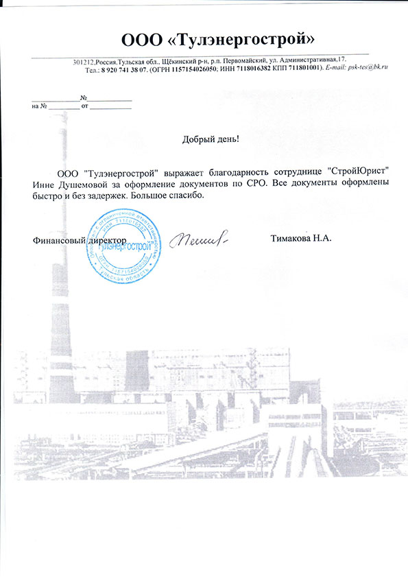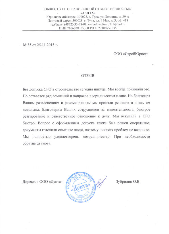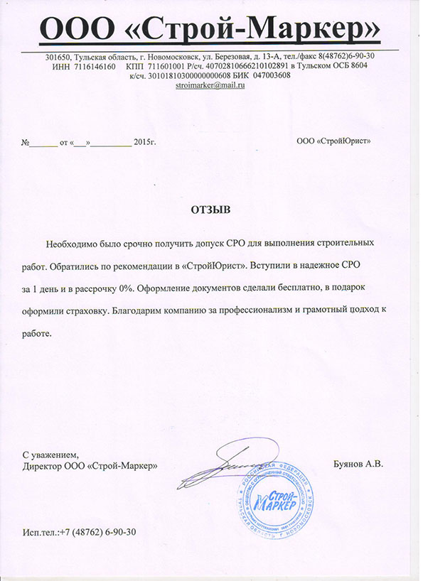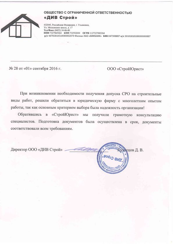 Отзывы клиентов "СтройЮрист" по вступлению в СРО в Череповце
