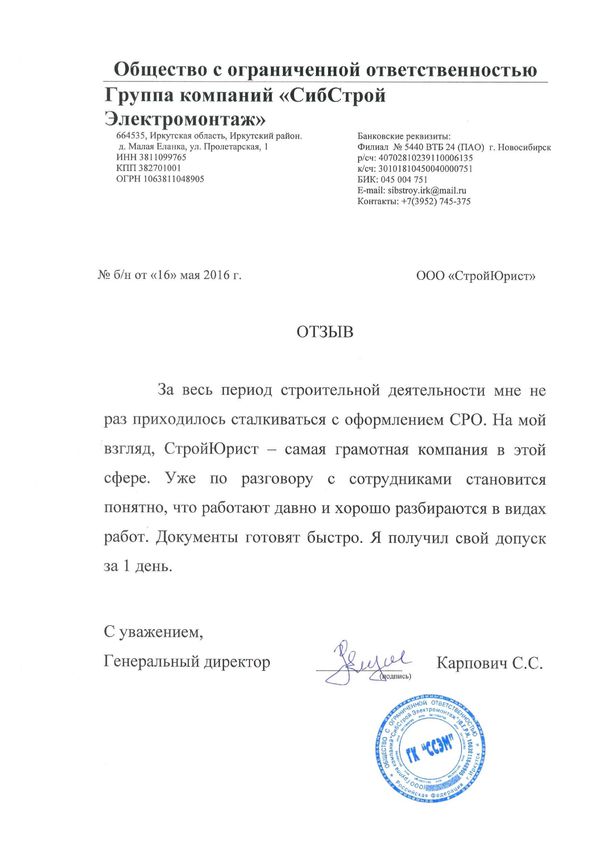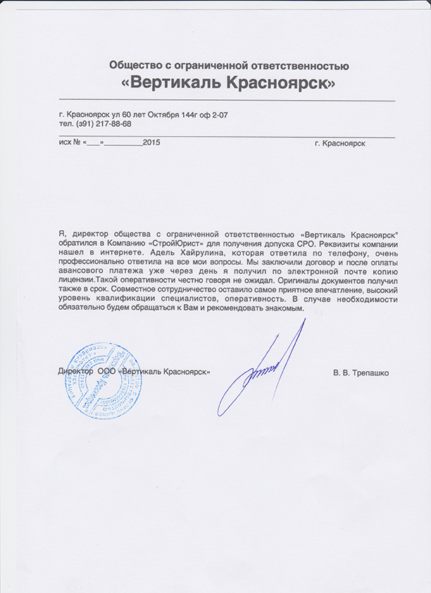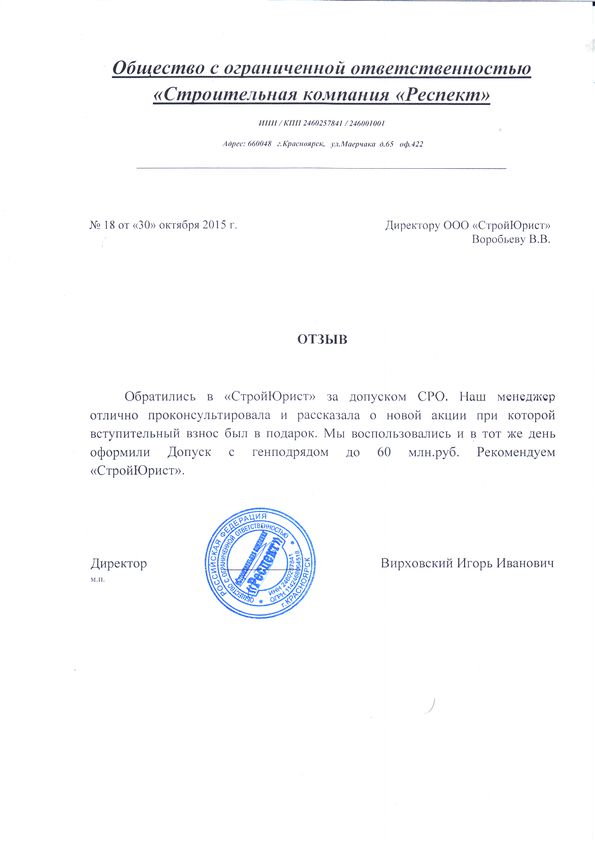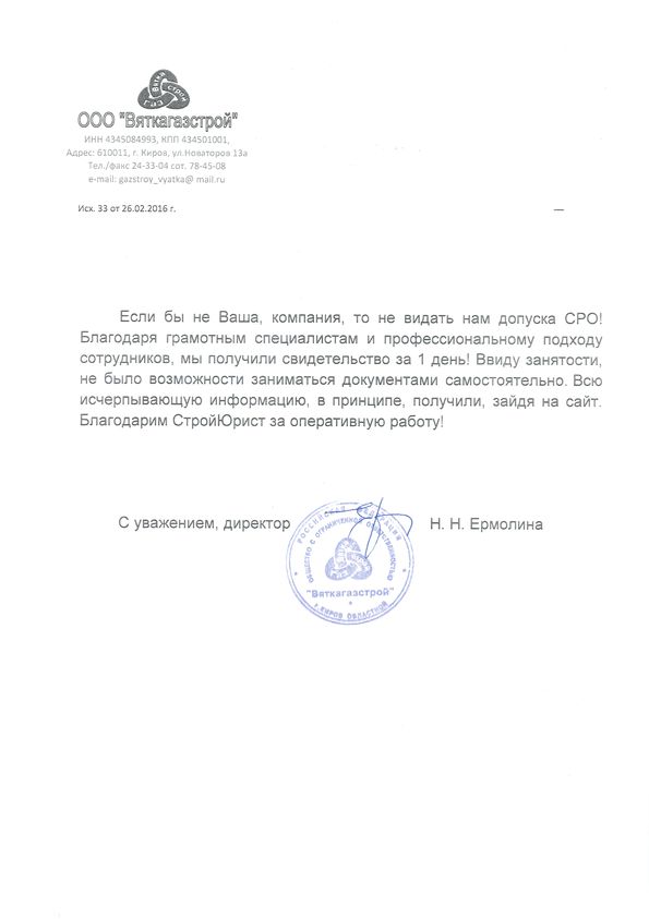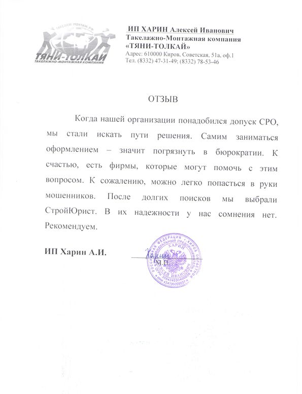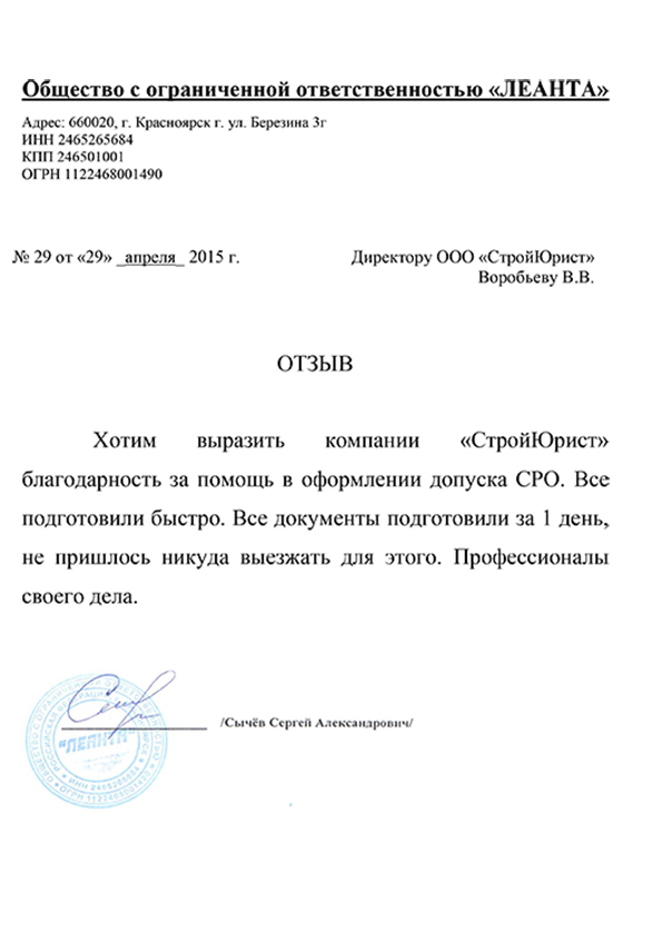 Отзывы клиентов "СтройЮрист" по вступлению в СРО в Череповце