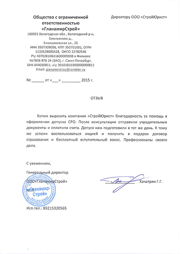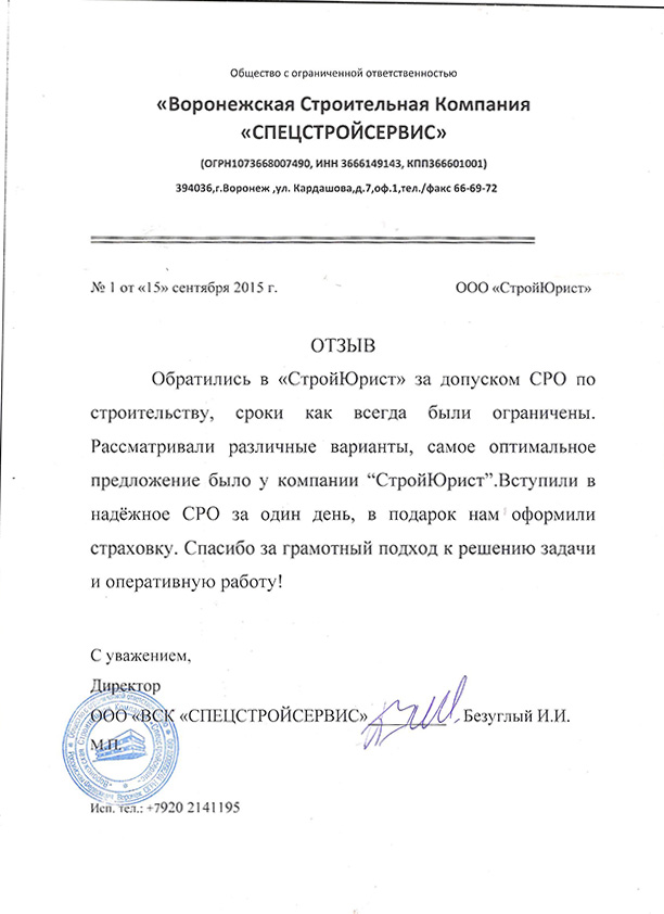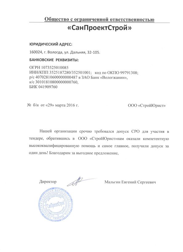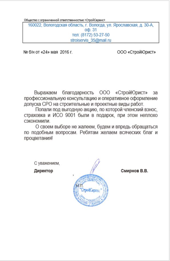 Отзывы клиентов "СтройЮрист" по вступлению в СРО в Череповце
